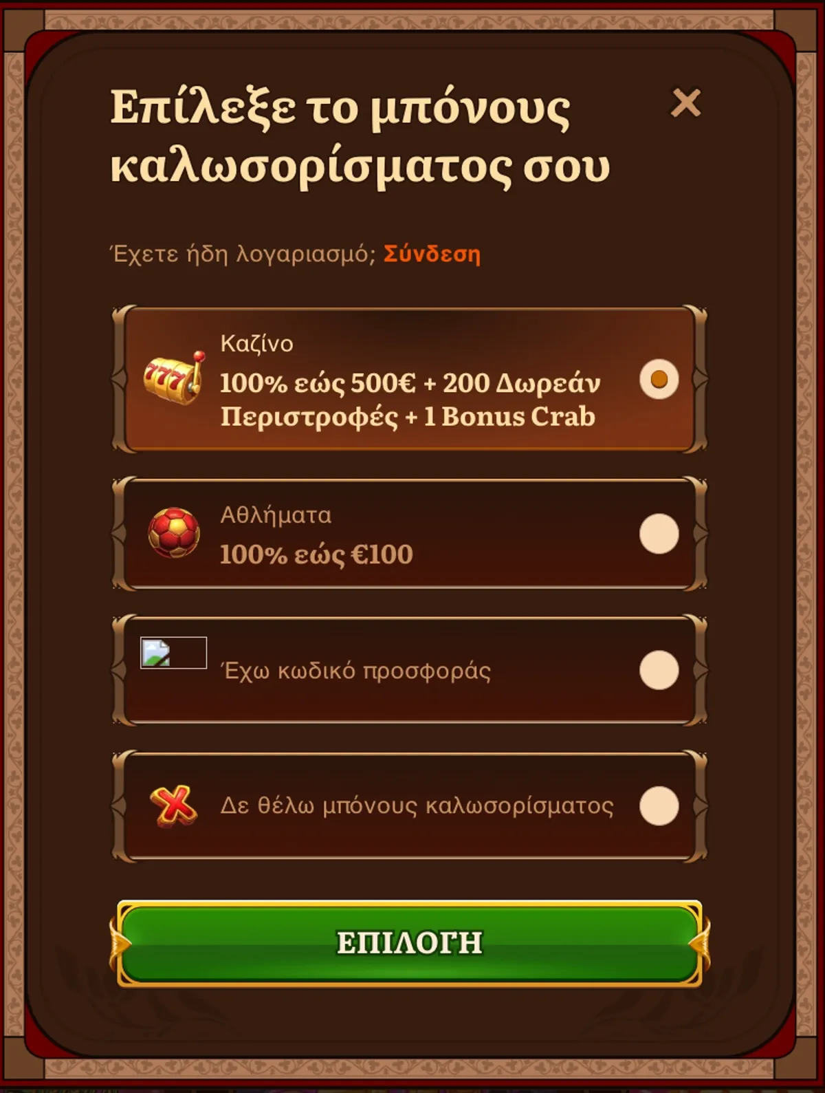 Επιλέγεις Καζίνο (500€ + 200 FS) ή Αθλητικό (150€) πακέτο |